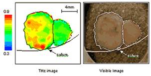 На рисунке показана картина раковой опухоли в терагерцовом и видимом спектральном диапазонах. Видно, что контраст на «терагерцовой» картинке значительно выше, поэтому хирург может избирательно работать именно с пораженными участками.