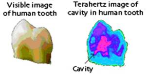 На этом рисунке представлен снимок человеческого зуба, снятый в видимом и терагерцовом спектральном диапазонах. На «терагерцовой» картинке ясно виден кариес, в то время как в видимом спектральном диапазоне зуб выглядит совершенно здоровым.