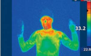 Эта картинка снята на длине волны 10 мкм в инфракрасном диапазоне, для которого собственное излучение объекта, имеющего температуру вблизи комнатной, максимально. Видно, например, что нос у человека заметно холоднее щек, что совершенно незаметно на активной картинке.