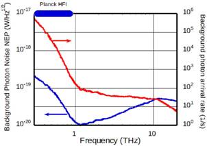 Дело в том, что минимум космического фона соответствует как раз частоте 1 ТГц (см. следующий рисунок). Интенсивность фонового излучения возрастает на более низких частотах из-за реликтового излучения, а на более высоких частотах – из-за излучения межгалактической пыли. Ясно, что чем ниже интенсивность фонового излучения, тем более слабые полезные сигналы на этом фоне можно зарегистрировать, т.е. заглянуть дальше в космическое пространство.