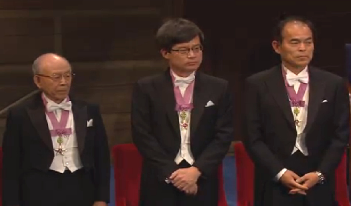 Рис. 1. Нобелевские лауреаты по физике 2014 года (слева направо): И.Акасаки, Х. Амано, Ш. Накамура, — на церемонии вручения Нобелевских премий в Стокгольме