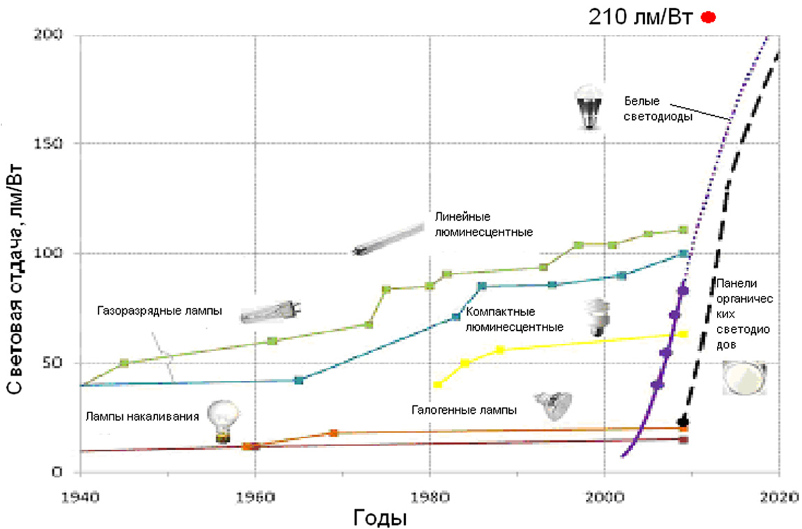 На рис. 3 показано, как изменялась, начиная с 1940 года, световая отдача (эффективность с учетом чувствительности зрения, размерность — [лм/Вт]) разных источников света — ламп накаливания и люминесцентных ламп. В правой части рисунка показана световая отдача светодиодов белого свечения, начиная с 2002 года, когда она достигла световой отдачи ламп накаливания. Показаны предсказания о ней до 2020 года, сделанные фирмой «Navigant Consulting» в 2009 году. Уже в 2010 году световая отдача белых светодиодов превысила 100 лм/Вт, то есть стала конкурентно способной с люминесцентными лампами, а в 2013 г. предсказания были превышены вдвое, ?Ф=210 лм/Вт (красная точка на рис. 2). В марте 2014 г. американская фирма «Cree» сообщила о рекордной световой отдаче белых светодиодов: ?Ф=303 лм/Вт!