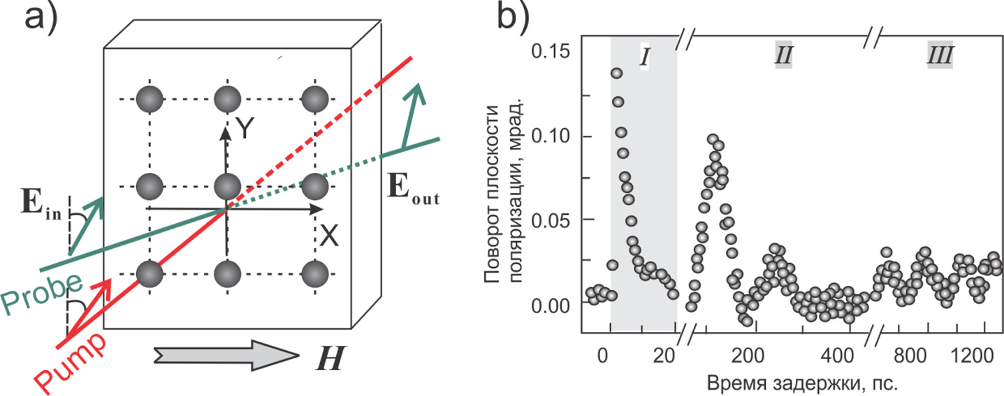Рисунок 1. (a) Схема эксперимента по изучению динамики поворота плоскости поляризации в массиве магнитных наночастиц в схеме «накачка-зондирование». (b) Типичная ависимость угла поворота плоскости поляризации пробного излучения от времени задержки относительно импульса накачки.