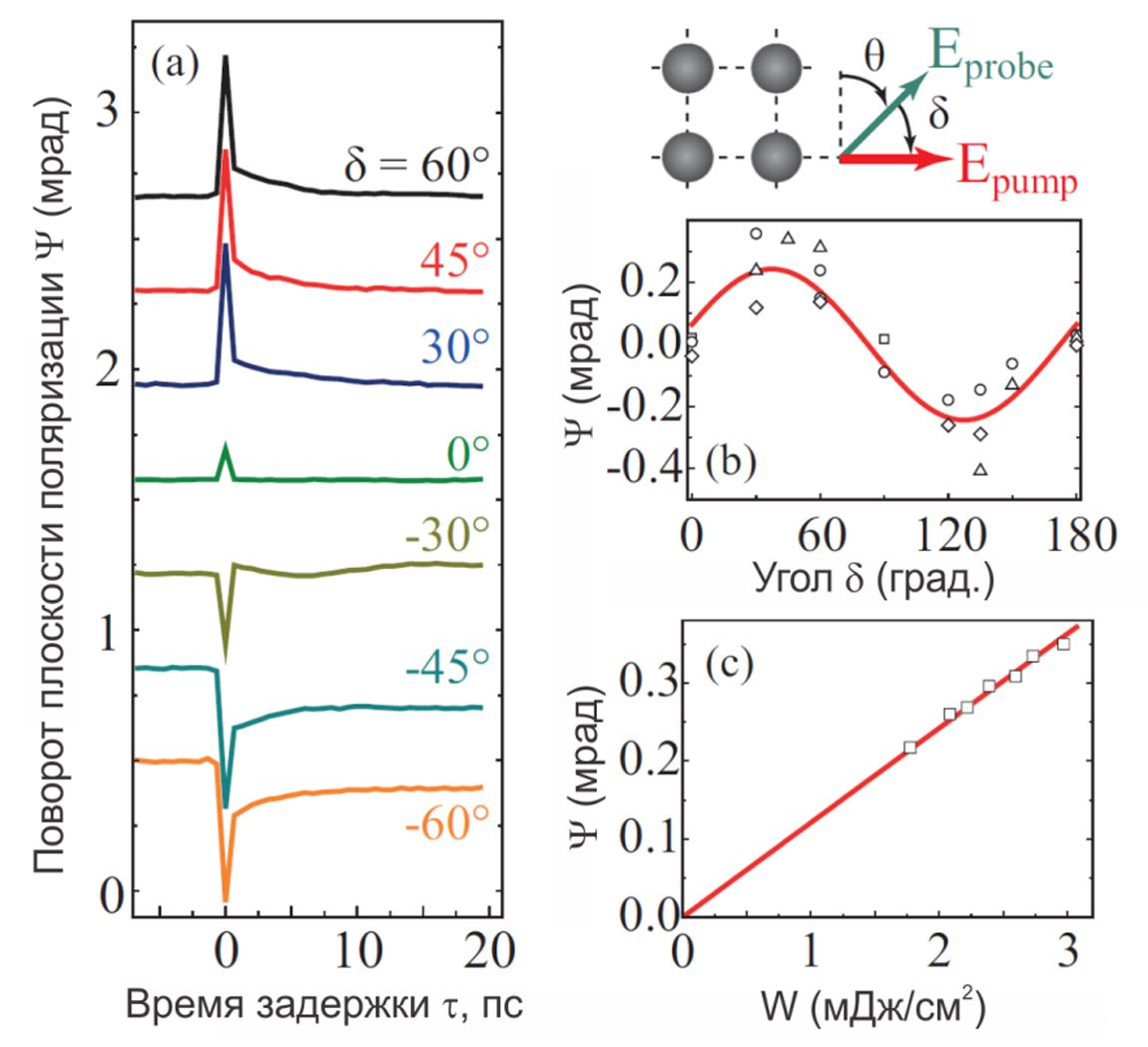 Можно заметить, что в случаях, когда плоскости поляризаций накачки и пробного луча параллельны или перпендикулярны, быстрого лазерно-индуцированного поворота плоскости поляризации не наблюдается; эффект максимален для δ=±45°, что хорошо видно на Рис. 2,b. Механизм данного эффекта состоит в оптически наведенном двулучепреломлении, индуцированном быстрой электронной керровской нелинейностью металлических частиц, с оптической осью, соответствующей плоскости поляризации мощного излучения накачки. Аппроксимация экспериментальных данных, выполненная с учетом симметрии тензора кубичной нелинейности изотропной среды, приведена сплошной линией на Рис. 2,b и находится в хорошем соответствии с экспериментом.
