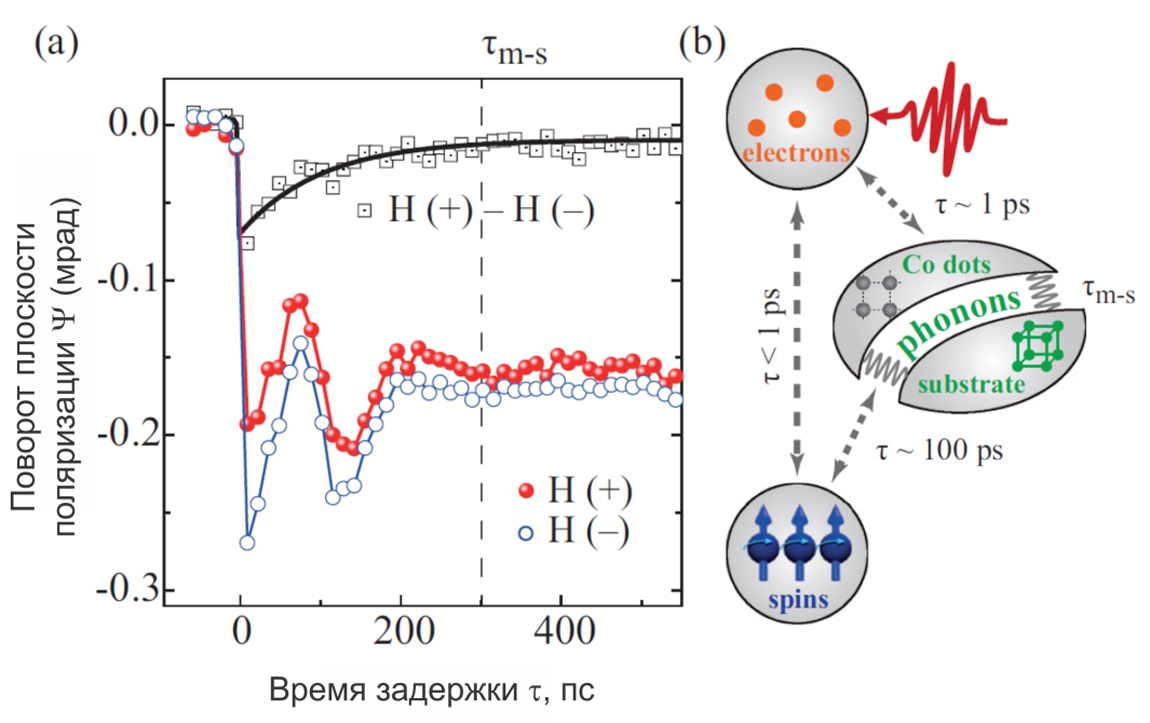 На Рис. 3,b изображена схема трехтемпературной модели, которая части используется для описания процессов магнитной динамики в ферромагнитных структурах. Согласно этой модели, возбуждение коротким лазерным импульсом приводит к сверхбыстрому (на временах около единиц фемтосекунд) росту температуры электронов и созданию их неравновесного распределения. Эта система вступает во взаимодействие с двумя другими резервуарами, а именно спиновым и фононным, постепенно релаксируя к своему исходному состоянию. Динамика этих процессов в большой степени определяется видом и параметрами вещества. Для 3d переходных металлов релаксация электронно-спиновой системы наблюдается обычно на субпикосекундных временах, приводя к сверхбыстрому (полному или частичному) размагничиванию структуры. Этот процесс проявляется в резком изменении угла Ψ при малых значениях τ, отчетливо заметном на Рис. 3,а. Последующая передача энергии от электронно-спиновой системы решетке металла наблюдается на значительно бóльших временах, что также видно по приведенным экспериментальным зависимостям.