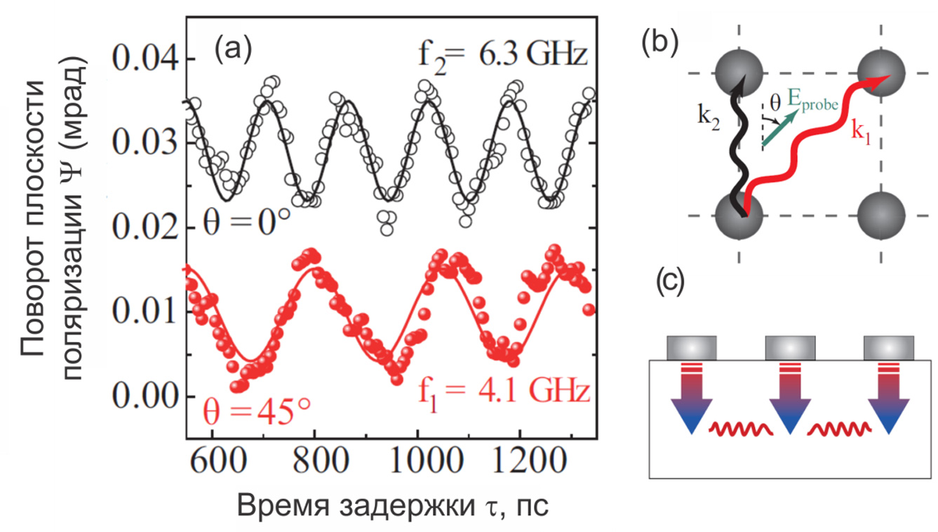 В эксперименте были выделены две моды осцилляций (см. Рис. 4,а), периоды которых, определенные из Фурье-анализа экспериментальных зависимостей, составили приблизительно 4.1 ГГц и 6.3 ГГц. Следует отметить, что отношение этих частит близко к значению √2. Было показано, что амплитуда и фаза этих колебаний не зависели от приложенного магнитного поля и длины волны пробного излучения, а также, что период осцилляций не зависит от поляризации излучение накачки.
