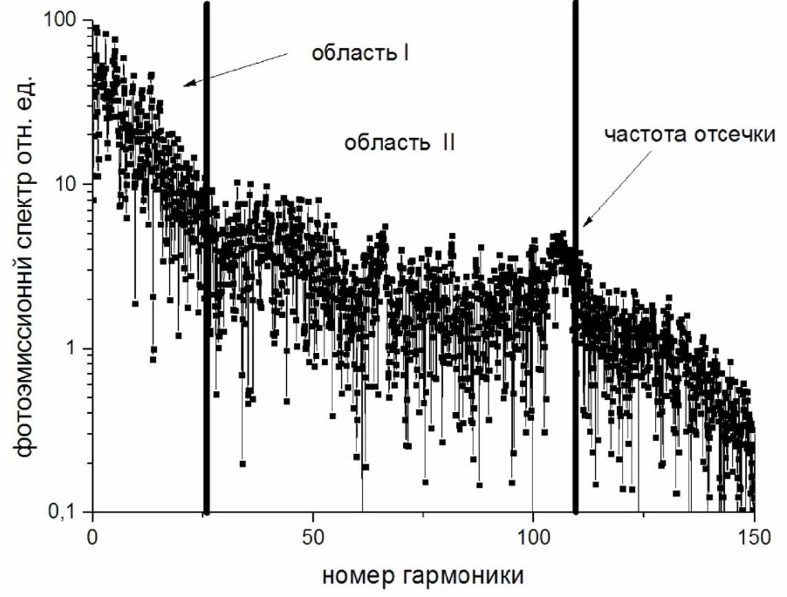 Спектр гармоник высокого порядка обладает рядом особенностей, его условно можно разделить на 3 части: область, когда интенсивность гармоник обратно пропорциональна их номеру (область I), область, где интенсивность гармоник практически не зависит от номера (область плато, область II) и частота отсечки — как граница области плато (см. рис. 1), — после которой эффективность генерации гармоник резко падает.