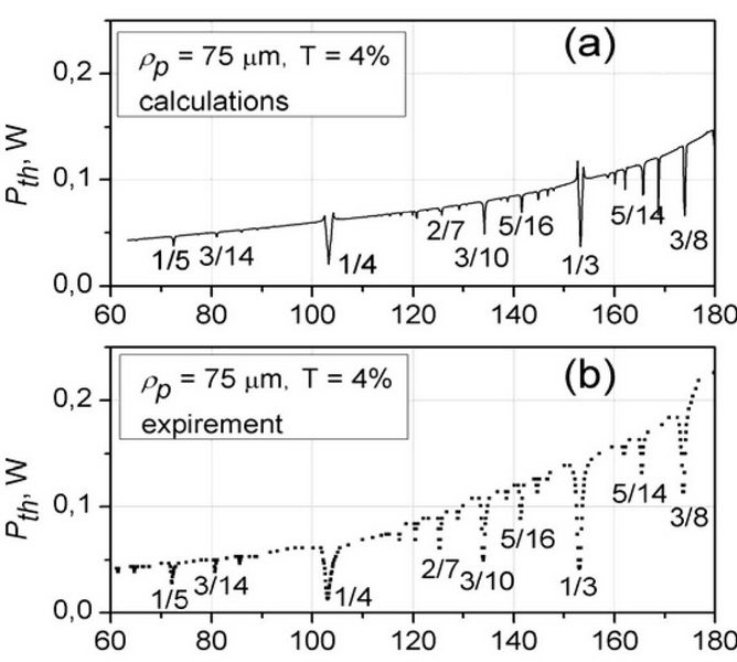 = 75 ?m и коэффициентепропускания выходного зеркала 4%: a) расчёт, b) эксперимент.Несократимые дроби r/s показаны ниже провалов порогов генерации.