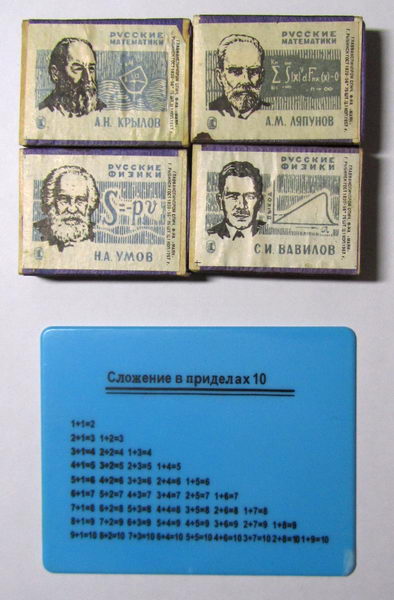 Но речь не о спичках, а о том, что изображено на коробках, на части коробков. Портреты ученых — математики, физики. А.М. Ляпунов, А.Н. Крылов, Н.А. Умов, С.И. Вавилов, и др. Это в сериях «Русские математики». «Русские физики». Есть, конечно, и традиционные оформления, посвященные спорту, историческим местам (типа «Подмосковные усадьбы»), историческим датам и праздникам.