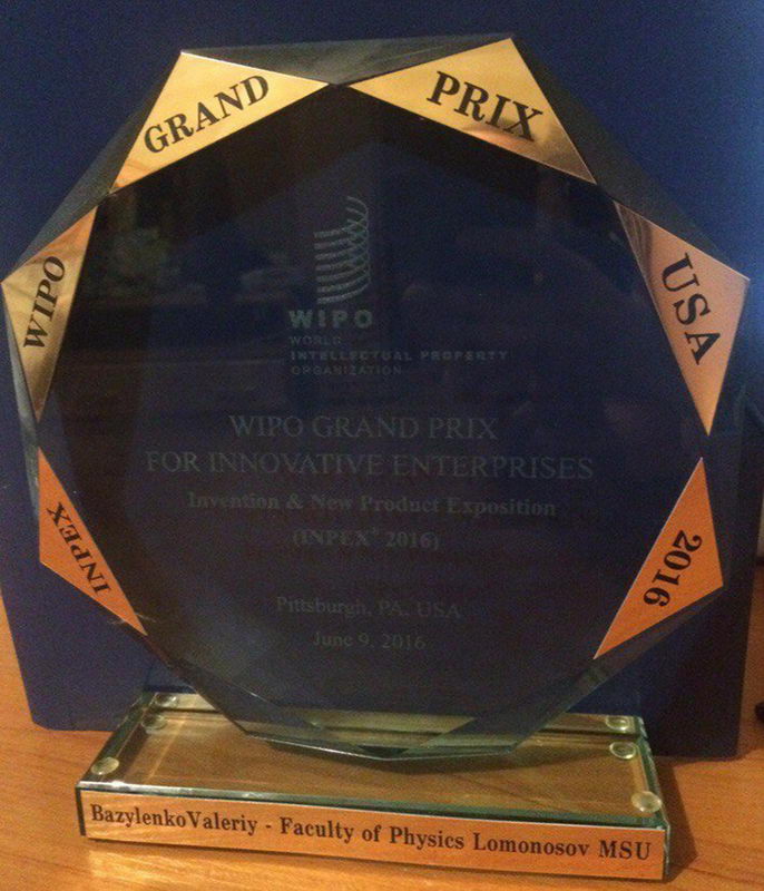 В июне 2016 года в г. Питтсбурге, США, состоялась крупнейшая 31-я Международная выставка изобретений и новой техники INPEX-2016, организуемая Всемирной Организацией Интеллектуальной Собственности WIPO, являющейся структурным подразделением ООН (таким же, как ЮНЕСКО или МАГАТЭ), объединяющей 187 стран и около 250 неправительственных организаций. Российская экспозиция формировалась Министерством образования и науки РФ, которая выбрала работу нашего коллеги действительного члена Международной академии авторов научных открытий и изобретений, к.ф.-м.н. Базыленко В.А., вошедшую в 2010 году в перечень «Сто лучших изобретений России». Суть работы — создание способа оптическими методами защиты от подделок и контроля подлинности ценных бумаг и изделий с использованием лазера и различных наноструктурированных материалов для записи и чтения скрытно нанесенных специальных защитных нанометок. Работа была награждена хрустальным Гран-При WIPO, а также Золотой медалью и Дипломом Минобрнауки РФ. Физический факультет также был награжден Дипломом Минобрнауки РФ «За активное участие в работе Российской экспозиции и высокий научно-технический уровень, представленной разработки».