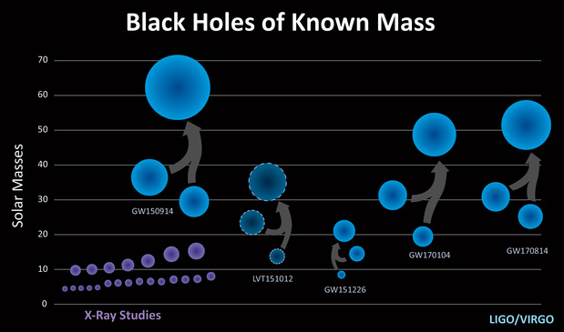 Рис. 2. Массы ЧД по наблюдениям ГВ детекторами LIGO/Virgo (данные на сентябрь 2017 г.). Рисунок с официального сайта LIGO https://www.ligo.caltech.edu/image/ligo20170927c.