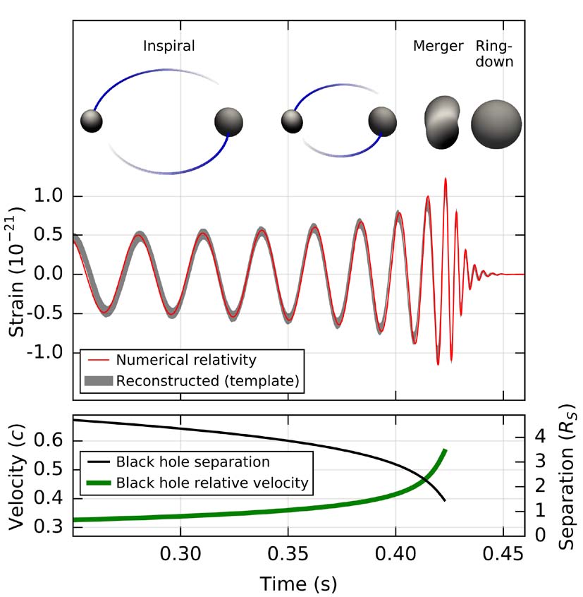 Рис. 1. Вверху: схематически стадии слияния двойной системы из ЧД. В середине: форма ГВ сигнала. Внизу: изменение расстояния между компонентами и их относительная скорость в процессе слияния. Из работы Abbot et al. PRL 116, 061102 (2016). |