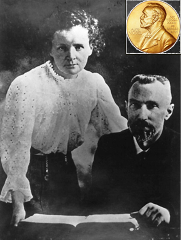 В 1903 г. Мария и Пьер Кюри совместно с Анри Беккерелем получили Нобелевскую премию по физике «за выдающиеся заслуги в совместных исследованиях явлений радиации». Они, наконец, получили возможность оснастить свою лабораторию необходимой аппаратурой и купить для своей квартиры ванну. Руки супругов Кюри покрылись ранами от постоянного контакта с радиоактивными образцами, что послужило возникновению идеи об использовании радия в медицинской практике. Это обстоятельство было подчёркнуто Пьером Кюри в его Нобелевской речи. После гибели мужа в результате трагической случайности (19 апреля 1906 года он попал под колёса конной повозки) Мария Кюри была назначена на его место в Парижском университете (официально как «исполняющая обязанности профессора кафедры») и с головой ушла в работу. В 1910 г. ей удалось в сотрудничестве с Андре Дебьёрном выделить чистый металлический радий, а не его соединения, как прежде. |