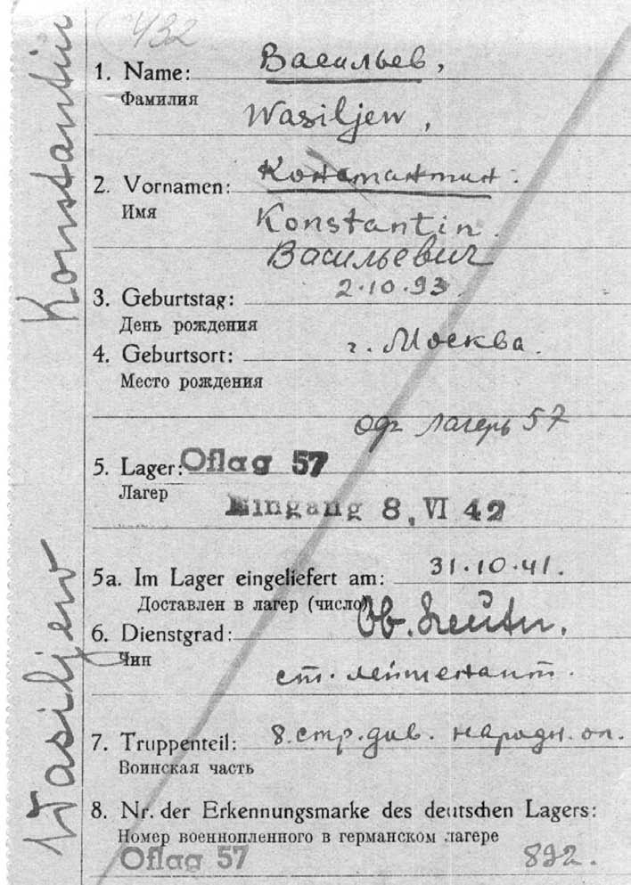 Учетная карта заключенного концентрационного лагеря — старшего лейтенанта 8 дивизии народного ополчения Константина Васильева |